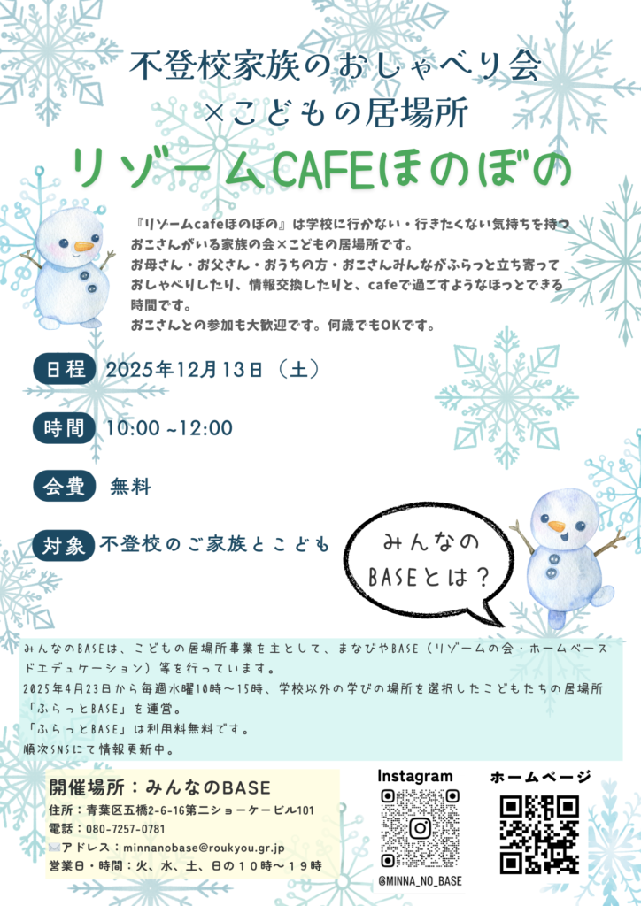 12月13日㈯リゾームcafeほのぼのを開催します。